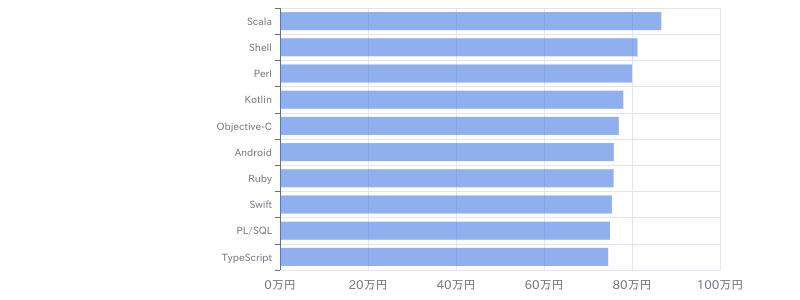 ランサーズエージェント(Lancers Argent)のフリーランス案件・求人の開発言語別平均単価は、①Scala:86.7万円、②Shell:81.3万円、③Perl:80万円、④Kotlin:78万円、⑤Objective-C:77万円、⑥Android:75.9万円、⑦Ruby:75.8万円、⑧Swift:75.4万円、⑨PL/SQL:75万円、⑩TypeScript:74.6万円となっています。(※フリーランスHub調べ/2026年3月) ランサーズエージェント(Lancers Argent)のフリーランス案件・求人の月額単価が高い開発言語は①Scala、②Shell、③Perlであることがわかります。ランサーズエージェント(Lancers Argent)のフリーランス案件・求人に参画を希望するフリーランスの方は①Scala、②Shell、③Perlを中心に複数の開発言語を用いた案件を検討されることをおすすめします。
