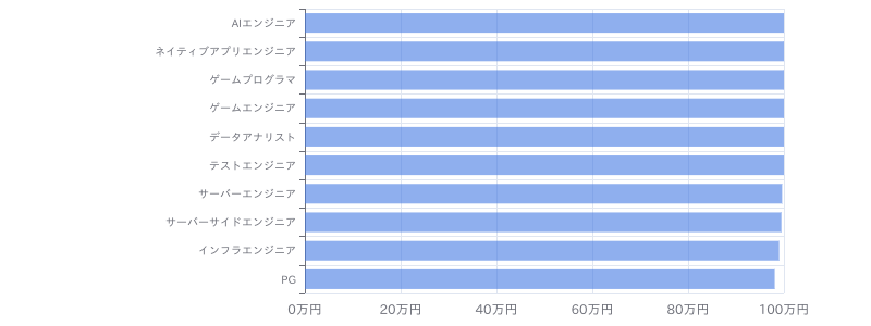 コンプロフリーランスのフリーランス案件・求人の職種別平均単価は、①AIエンジニア:100万円、②ネイティブアプリエンジニア:100万円、③ゲームプログラマ:100万円、④ゲームエンジニア:100万円、⑤データアナリスト:100万円、⑥テストエンジニア:100万円、⑦サーバーエンジニア:99.6万円、⑧サーバーサイドエンジニア:99.5万円、⑨インフラエンジニア:99万円、⑩PG:98.1万円となっています。(※フリーランスHub調べ/2025年10月) コンプロフリーランスのフリーランス案件・求人の月額単価が高い職種は①AIエンジニア、②ネイティブアプリエンジニア、③ゲームプログラマであることがわかります。コンプロフリーランスのフリーランス案件・求人に参画を希望するフリーランスの方は①AIエンジニア、②ネイティブアプリエンジニア、③ゲームプログラマの職種を中心に案件を検討されることをおすすめします。