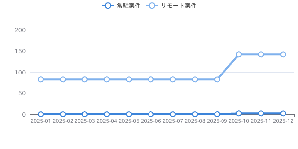 フリーランスHub内のCloudBuildersの案件数は144件です。リモート・常駐の内訳は、リモート案件が142件(98%)、常駐案件が2件(2%)となっています。(※フリーランスHub調べ/2025年12月)