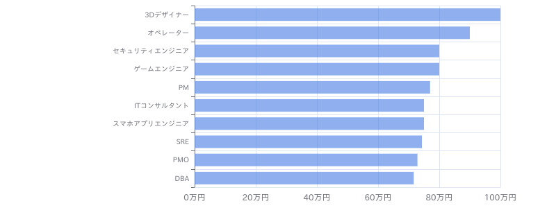 Unix × サーバーエンジニアのフリーランス案件・求人の職種別の平均単価は、①3Dデザイナー:100万円、②オペレーター:90万円、③セキュリティエンジニア:80万円、④ゲームエンジニア:80万円、⑤PM:77万円、⑥ITコンサルタント:75万円、⑦スマホアプリエンジニア:75万円、⑧SRE:74.3万円、⑨PMO:72.9万円、⑩DBA:71.7万円となっています。(※フリーランスHub調べ/2025年10月) Unix × サーバーエンジニアのフリーランス案件・求人の月額単価が高い職種は①3Dデザイナー、②オペレーター、③セキュリティエンジニアであることがわかります。