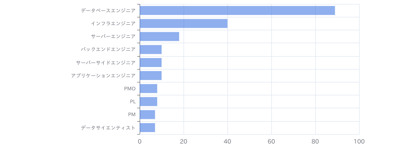 PHP × データベースエンジニアのフリーランス案件・求人の職種別案件数は、①データベースエンジニア:89件、②インフラエンジニア:40件、③サーバーエンジニア:18件、④バックエンドエンジニア:10件、⑤サーバーサイドエンジニア:10件、⑥アプリケーションエンジニア:10件、⑦PMO:8件、⑧PL:8件、⑨PM:7件、⑩データサイエンティスト:7件となっています。(※フリーランスHub調べ/2025年10月) PHP × データベースエンジニアのフリーランス案件・求人は①データベースエンジニア、②インフラエンジニア、③サーバーエンジニアが多いことが分かります。