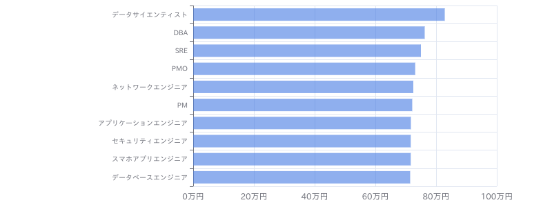 PHP × データベースエンジニアのフリーランス案件・求人の職種別の平均単価は、①データサイエンティスト:82.9万円、②DBA:76.3万円、③SRE:75万円、④PMO:73.1万円、⑤ネットワークエンジニア:72.5万円、⑥PM:72.1万円、⑦アプリケーションエンジニア:71.7万円、⑧セキュリティエンジニア:71.7万円、⑨スマホアプリエンジニア:71.7万円、⑩データベースエンジニア:71.5万円となっています。(※フリーランスHub調べ/2025年10月) PHP × データベースエンジニアのフリーランス案件・求人の月額単価が高い職種は①データサイエンティスト、②DBA、③SREであることがわかります。