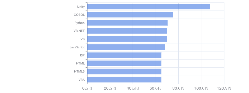 組込・制御 × 在宅・リモートのフリーランス案件・求人の開発言語別の平均単価は、①Unity:107.5万円、②COBOL:75万円、③Python:70.5万円、④VB.NET:70万円、⑤VB:70万円、⑥JavaScript:68.3万円、⑦JSP:65万円、⑧HTML:65万円、⑨HTML5:65万円、⑩VBA:65万円となっています。(※フリーランスHub調べ/2025年10月) 組込・制御 × 在宅・リモートのフリーランス案件・求人の月額単価が高い開発言語は①Unity、②COBOL、③Pythonであることがわかります。 組込・制御 × 在宅・リモートのフリーランス案件・求人に参画を希望するフリーランスの方は①Unity、②COBOL、③Pythonを中心に複数の開発言語を用いた案件を検討されることをおすすめします。