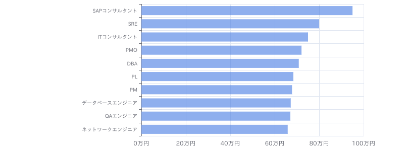 JP1 × インフラエンジニアのフリーランス案件・求人の職種別の平均単価は、①SAPコンサルタント:95万円、②SRE:80万円、③ITコンサルタント:75万円、④PMO:72万円、⑤DBA:70.8万円、⑥PL:68.4万円、⑦PM:67.8万円、⑧データベースエンジニア:67.2万円、⑨QAエンジニア:67万円、⑩ネットワークエンジニア:65.9万円となっています。(※フリーランスHub調べ/2025年10月) JP1 × インフラエンジニアのフリーランス案件・求人の月額単価が高い職種は①SAPコンサルタント、②SRE、③ITコンサルタントであることがわかります。