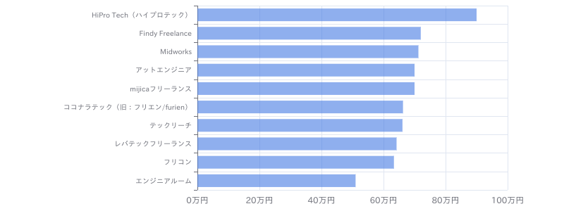 JP1 × インフラエンジニアのフリーランス案件・求人を保有しているフリーランスエージェント別の単価相場は、①HiPro Tech(ハイプロテック):90万円、②Findy Freelance:72万円、③Midworks:71.3万円、④アットエンジニア:70万円、⑤mijicaフリーランス:70万円、⑥ココナラテック(旧:フリエン/furien):66.3万円、⑦テックリーチ:66.1万円、⑧レバテックフリーランス:64.2万円、⑨フリコン:63.4万円、⑩エンジニアルーム:51万円となっています。(※フリーランスHub調べ/2025年10月) JP1 × インフラエンジニアのフリーランス案件・求人の月額単価が高いフリーランスエージェントは①HiPro Tech(ハイプロテック)、②Findy Freelance、③Midworksであることがわかります。 JP1 × インフラエンジニアのフリーランス案件・求人に参画を希望するフリーランスの方は①HiPro Tech(ハイプロテック)、②Findy Freelance、③Midworksを中心に複数のフリーランスエージェントに登録することをおすすめします。