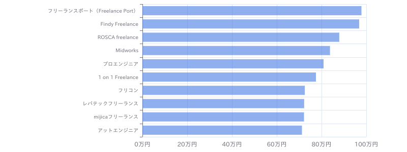 JavaScript × フロントエンドエンジニアのフリーランス案件・求人を保有しているフリーランスエージェント別の単価相場は、①フリーランスポート(Freelance Port):97.8万円、②Findy Freelance:96.8万円、③ROSCA freelance:87.9万円、④Midworks:83.8万円、⑤プロエンジニア:80.9万円、⑥1 on 1 Freelance:77.5万円、⑦フリコン:72.5万円、⑧レバテックフリーランス:72.2万円、⑨mijicaフリーランス:72.2万円、⑩アットエンジニア:71.3万円となっています。(※フリーランスHub調べ/2025年9月) JavaScript × フロントエンドエンジニアのフリーランス案件・求人の月額単価が高いフリーランスエージェントは①フリーランスポート(Freelance Port)、②Findy Freelance、③ROSCA freelanceであることがわかります。 JavaScript × フロントエンドエンジニアのフリーランス案件・求人に参画を希望するフリーランスの方は①フリーランスポート(Freelance Port)、②Findy Freelance、③ROSCA freelanceを中心に複数のフリーランスエージェントに登録することをおすすめします。